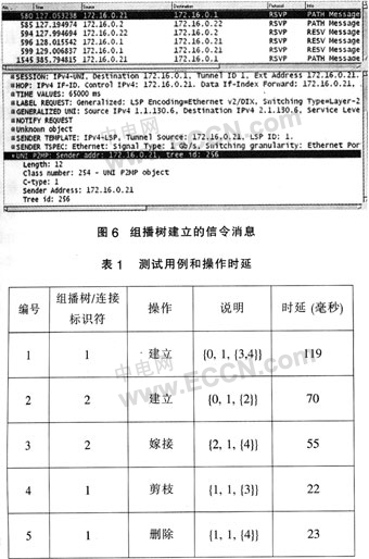 1出發(fā)的組播樹和單播連接,結(jié)果如表1所列。圖6顯示了Ethereal捕獲的組播樹建立的信令消息。在解開的Path消息中,可以發(fā)現(xiàn)經(jīng)過擴(kuò)展的UNI組播對(duì)象。然后,對(duì)已存在的連接進(jìn)行了動(dòng)態(tài)的修改。在第三個(gè)測(cè)例中,一個(gè)葉子被添加到單播連接上并使其變?yōu)橐豢媒M播樹。在嫁接和剪枝的操作中,業(yè)務(wù)生成器在已建立的連接上沒有觀察到丟包的現(xiàn)象。