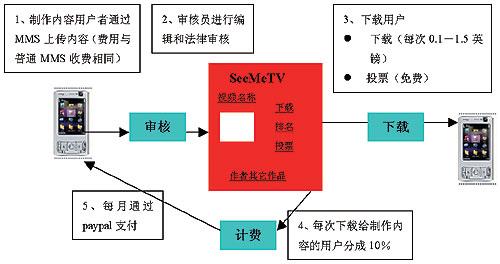 M1新加坡移動(dòng)運(yùn)營(yíng)商M1推出了用戶制作及共享視頻業(yè)務(wù)——MeTV,用戶可以通過MMS上傳視頻內(nèi)容,其它用戶可以瀏覽并下載。這項(xiàng)業(yè)務(wù)為用戶提供了一個(gè)展示自己和了解他人的平臺(tái)。這個(gè)業(yè)務(wù)也建立了與用戶分成的模式,用戶可以從自己上傳的內(nèi)容中獲得利潤(rùn)。用戶上傳的視頻內(nèi)容,被他人下載一次,用戶就可以獲得0.05新元。自從2007年3月該業(yè)務(wù)推出以來,已經(jīng)有超過4萬名用戶,收入最高的用戶已經(jīng)達(dá)到50~100新元。