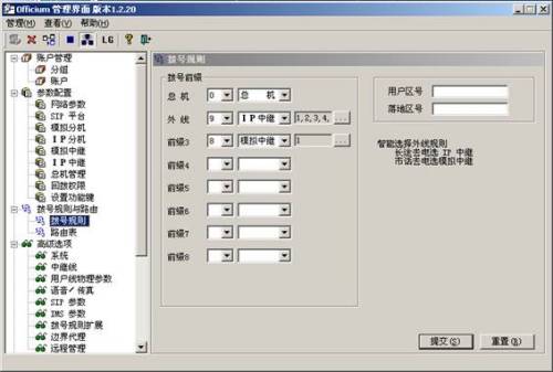 IP PBX 進(jìn)行配置(如圖)。人機(jī)界面簡(jiǎn)潔易懂,即便是不懂通訊的外行人,在看過(guò)說(shuō)明書(shū)后也能輕松自如地使用。配置起來(lái)簡(jiǎn)單,例如選擇外線(xiàn)撥號(hào)前綴號(hào)、做呼叫中心時(shí)的ACD輪循分機(jī)線(xiàn)路輪循、回?fù)艿,僅僅選下數(shù)字點(diǎn)下提交,幾秒內(nèi)就可配置結(jié)束。