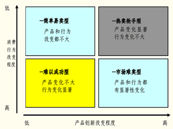 一般來(lái)說(shuō),產(chǎn)品創(chuàng)新程度越大,取得突破性的成就就越大,但這往往需要消費(fèi)者改變消費(fèi)行為和習(xí)慣。消費(fèi)行為的改變是一個(gè)漸進(jìn)的過(guò)程。對(duì)于企業(yè)來(lái)說(shuō),開(kāi)發(fā)一個(gè)對(duì)客戶有價(jià)值的創(chuàng)新產(chǎn)品,要想獲得成功,必須盡量減少消費(fèi)者行為的改變。我們以消費(fèi)行為改變程度和產(chǎn)品創(chuàng)新改變程度兩方面進(jìn)行組合得到一個(gè)矩陣: