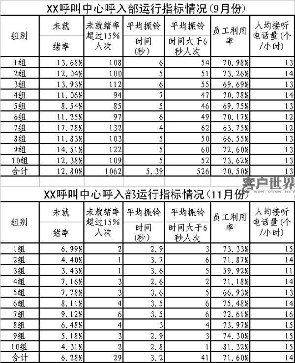 筆者所在呼叫中心從今年10月份開始實行“四率管理”,以解決現場管理工作的存在的問題,提高現場管理水平,提高服務效率。從統(tǒng)計數據看(見下表),實行“四率管理”后,呼叫中心的現場管理水平得到大幅提高,服務指標增長較快。在員工利用率基本保持不變的情況下,未就緒率、平均振鈴時間、每小時接聽電話量等指標均得到有效改善。其中,未就緒率從9月份的12.8%降低到6.3%,未就緒率低于15%的員工人次從1062次降低到29次;平均振鈴時間從5.4秒降低到3.2秒,平均振鈴時間大于6秒的人次從526人次降低到41人次。每小時人均接聽電話數量從13個提高到14個。按8小時工作計算,每人每天接聽電話數量增長10個左右。具體統(tǒng)計數據見下表。
