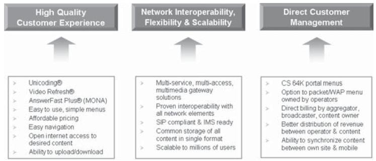雖然視頻和多媒體服務的突然火熱對消費者、企業(yè)和業(yè)界來說都是件好事,但存在的挑戰(zhàn)還是很多,如怎樣提供高質(zhì)量的用戶體驗、解決手機和網(wǎng)絡可互操作性問題,以及集成商、廣播媒體和內(nèi)容提供商的直接用戶接觸與管理問題。這些問題的主要技術解決方案提供者有Unicoding、Video Refresh和AnswerFast Plus (MONA的一部分),同時多媒體網(wǎng)關解決方案也包括在內(nèi)。其它方面的可互操作性和用戶體驗改善問題很容易能解決,對今天現(xiàn)有的WAP服務是一種補充。
