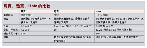 惠普的Halo工作室系統(tǒng)強調可用于企業(yè)遠程模擬面對面業(yè)務會議。通過Halo連接,每個Halo工作室可支持會議桌前排六人,第二排三至六人,最多12人的會議規(guī)模。每個工作室有三臺等離子顯示器,參會人員能夠看到與本人同樣大小的圖像。另外,參會者還可使用一個安裝在等離子顯示器上方的50英寸的協(xié)作屏幕,與其他Halo工作室中的人員共享其筆記本電腦中的文件與數(shù)據(jù)。工作室還包括一個高清圖文攝像機,可用于拍攝桌上的物品并顯示在協(xié)作顯示器上,真實呈現(xiàn)色彩、陰影與細微之處。同時配備的電話讓與會者可以與Halo工作室外的人員聯(lián)系。工作室配備了廣播質量的音頻與照明設施,參會者可以使用屏幕上簡便的用戶界面,通過點擊鼠標開始協(xié)作。一個復雜的軟件控制系統(tǒng)將確保各個Halo工作室輕松、無縫地協(xié)同工作。