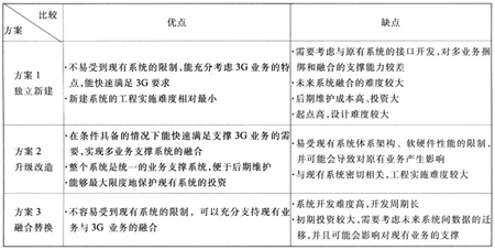 由于國內(nèi)電信運營商一般已建有業(yè)務(wù)支撐系統(tǒng),因此在進入到3G時代后就面臨著如何選擇3G融合計費系統(tǒng)建設(shè)方式的問題。3G融合計費系統(tǒng)的建設(shè)方案主要有獨立新建、升級改造、融合替換三種。三種不同的建設(shè)方案對比分析見表2。