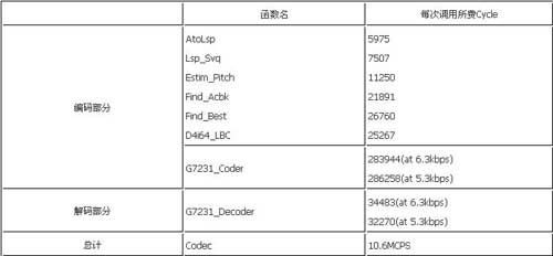 經(jīng)過(guò)C語(yǔ)言級(jí)和匯編級(jí)的多種優(yōu)化,最后實(shí)現(xiàn)了一路G.723.1的編解碼需要花費(fèi)10.6MCPS,整個(gè)代碼的程序空間為208K byte(程序中包括了部分c6201的庫(kù)函數(shù)),數(shù)據(jù)空間為8K byte,碼本大小20k byte,多通道的上下文數(shù)據(jù)為1.48K byte。200MHz的C6201每秒可以實(shí)時(shí)編解碼16路語(yǔ)音信號(hào)。所有代碼全部通過(guò)了ITU-T測(cè)試矢量的測(cè)試。表1是各主要模塊的運(yùn)算量。