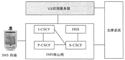 IMS的VS業(yè)務(wù)架構(gòu)如圖2所示,由IMS終端(支持SIP協(xié)議手機(jī))、IMS核心網(wǎng)、VS應(yīng)用服務(wù)器、支撐系統(tǒng)4部分構(gòu)成。IMS移動(dòng)終端提供了用戶使用VS業(yè)務(wù)的操作界面,包括VS業(yè)務(wù)發(fā)起、視頻播放、視頻存儲(chǔ)、VS業(yè)務(wù)應(yīng)答等功能。IMS核心網(wǎng)在支持視頻共享業(yè)務(wù)中,涉及到P-CSCF、S-CSCF、I-CSCF等網(wǎng)元,這些網(wǎng)元的作用是完成SIP移動(dòng)終端之間會(huì)話控制功能,包括會(huì)話的建立、會(huì)話的保存、會(huì)話的釋放等過程。VS應(yīng)用服務(wù)器是VS業(yè)務(wù)系統(tǒng)中最關(guān)鍵的功能實(shí)體,其功能包括對(duì)VS業(yè)務(wù)的請求進(jìn)行信令和媒體流的控制。由于基于IP的H.263協(xié)議能保證在較低的帶寬下傳送較高質(zhì)量的視頻流,因此首選H.263作為VS業(yè)務(wù)的視頻壓縮協(xié)議。此外,為了實(shí)現(xiàn)不同編碼能力的終端能進(jìn)行業(yè)務(wù)互通,VS應(yīng)用服務(wù)器還具備媒體編碼轉(zhuǎn)換的功能。VS應(yīng)用服務(wù)器另一重要的功能就是實(shí)現(xiàn)VS業(yè)務(wù)計(jì)費(fèi),它支持基于業(yè)務(wù)計(jì)費(fèi)、事件計(jì)費(fèi)、時(shí)間計(jì)費(fèi),流量計(jì)費(fèi)等多種靈活的計(jì)費(fèi)方式,并生成計(jì)費(fèi)話單。支撐系統(tǒng)的功能主要是實(shí)現(xiàn)VS業(yè)務(wù)定購、業(yè)務(wù)取消、計(jì)費(fèi)話單的收集匯總等。