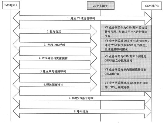 由于GSM網(wǎng)絡(luò)不可能立刻被替換掉,因此在一段時(shí)期內(nèi)會(huì)出現(xiàn)3G IMS網(wǎng)絡(luò)和GSM網(wǎng)絡(luò)共存的局面。VS作為IMS中的典型業(yè)務(wù)將隨著IMS網(wǎng)絡(luò)的部署得到大力推廣,此時(shí)會(huì)出現(xiàn)基于SIP協(xié)議的IMS終端用戶和GSM用戶終端進(jìn)行VS業(yè)務(wù)互通的需求,下文將對(duì)這種業(yè)務(wù)需求的實(shí)現(xiàn)方案進(jìn)行詳細(xì)介紹。