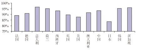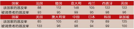 由于所調(diào)查的大多數(shù)是成熟市場(chǎng),因此大多數(shù)國家的移動(dòng)電話普及率超過75%。其中,普及率超過90%意味著有的用戶可能有幾張SIM卡。