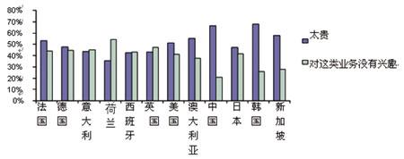此外,還有一些被調(diào)查者表示愿意接受廣告以換取手機(jī)電視和電影大片。對(duì)于兩種不同的業(yè)務(wù),用戶對(duì)這一問題的反應(yīng)相似。在各個(gè)國家中,荷蘭用戶的接受比率較低;在歐洲,西班牙與意大利的接受程度很高;在亞洲,日本、韓國和新加坡的接受比率也很高。(見圖7)