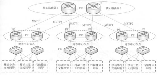 省中心核心節(jié)點(diǎn)配置兩臺(tái)高端路由器作為承載網(wǎng)的核心P路由器,同時(shí)配置兩臺(tái)高性能三層交換機(jī)作為PE設(shè)備,對(duì)省中心的各網(wǎng)管核心服務(wù)器進(jìn)行接入。