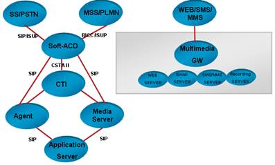 目前市場最常見的第三代呼叫中心是傳統(tǒng)的基于TDM的呼叫中心,應(yīng)用了計(jì)算機(jī)電話集成(CTI)技術(shù)。隨著網(wǎng)絡(luò)的普及和NGN的發(fā)展,出現(xiàn)第五代呼叫中心NGCC。NGCC是以NGN為基礎(chǔ)構(gòu)建的呼叫中心系統(tǒng),核心控制設(shè)備處理呼叫的能力較傳統(tǒng)呼叫中心大幅提高。NGCC的網(wǎng)絡(luò)架構(gòu)和接口如圖3所示。