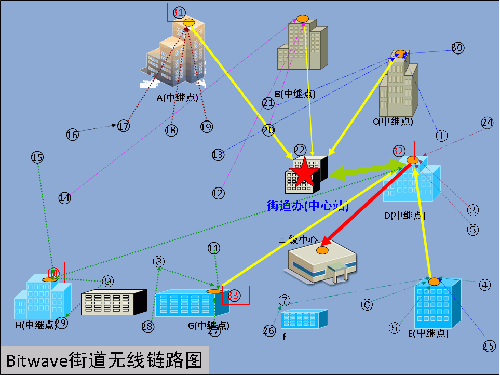 例如,遠(yuǎn)端地面點(diǎn)與主控中心有樓房、樹木等障礙物遮擋,Bitwave采用中繼的模式,在遠(yuǎn)端地面點(diǎn)和中心點(diǎn)都可視的高點(diǎn)建筑物上架設(shè)一收一發(fā)的兩臺(tái)BWB210無(wú)線網(wǎng)橋,通過(guò)功分器或交換機(jī)將遠(yuǎn)端點(diǎn)的信號(hào)傳送到中心點(diǎn),很好的解決了遠(yuǎn)端點(diǎn)與中心點(diǎn)不可視情況下鏈路無(wú)法搭建的問(wèn)題。