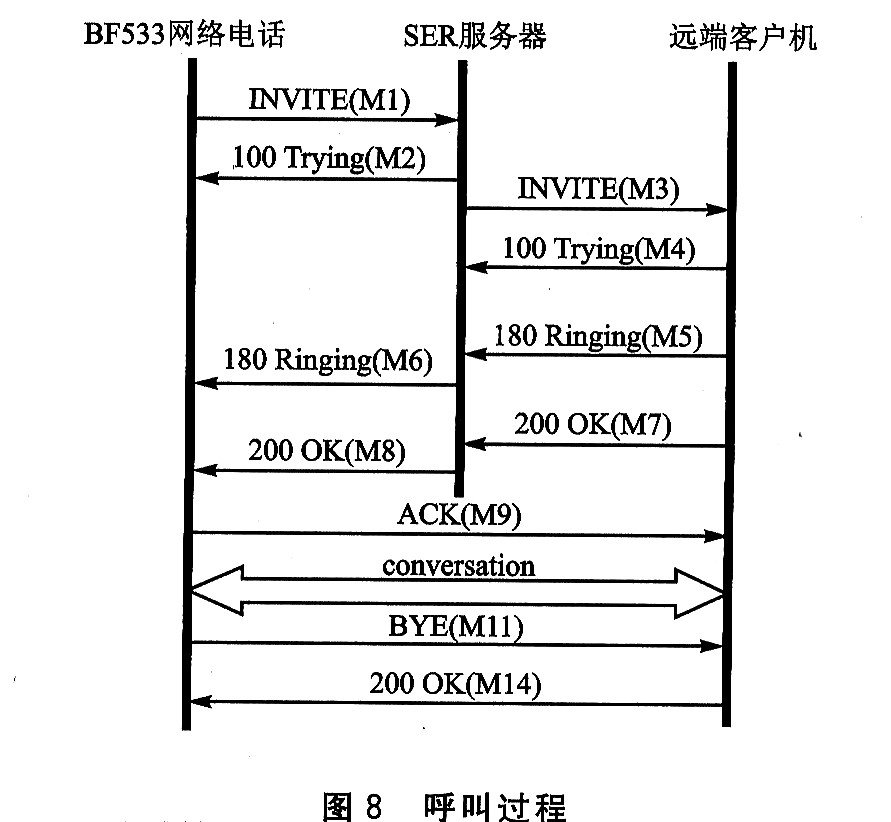 呼叫過程如圖8所示。BF533網(wǎng)絡(luò)電話(BP)先是向SER服務(wù)器發(fā)送了一條INⅥTE消息(M1),要求與遠端客戶機(RC)進行對話。SER馬上回復(fù)一條100