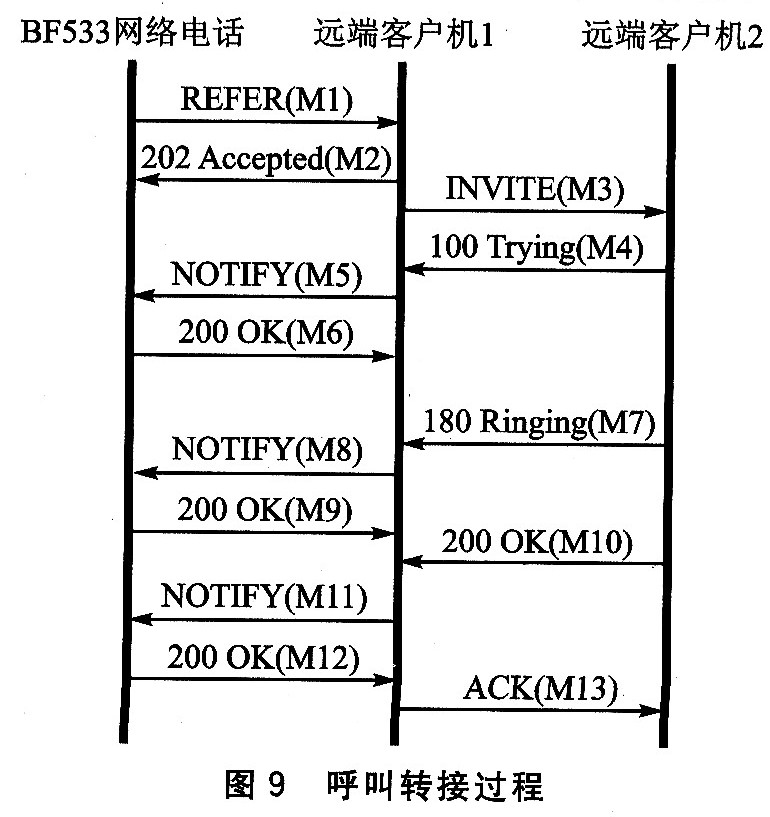 該過程是通過擴展的SIP信令REFER來完成的,交互過程如圖9所示。當(dāng)BF533網(wǎng)絡(luò)電話要將它和遠端客戶機1(RCl)的通話轉(zhuǎn)接到遠端客戶機2(RC2)時,BF發(fā)送REFER(M1)給RCl,該信息中Refer—To字頭標(biāo)明了RC2的URL,之后RCl回復(fù)202
