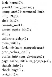 在系統(tǒng)啟動(dòng)后,最先調(diào)用的是針對32位微處理器MCF5249的特定的arch文件夾內(nèi)mmcontr.S文件。最后跳到main.c中的start_kernel()。μClinux/Linux-2.4.X/init/main.c中包含了對Linux系統(tǒng)初始化的代碼。其中stan_kernel()包含主要的初始化代碼。