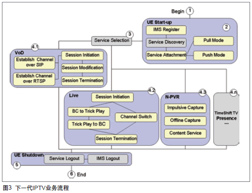基于網(wǎng)絡(luò)視訊框架的下一代IPTV的業(yè)務(wù)流程具有完整的生命周期,其生命周期始于UE開(kāi)機(jī)階段,活躍于業(yè)務(wù)使用階段,終止于UE關(guān)機(jī)階段,如圖3。其細(xì)分的業(yè)務(wù)流程包含以下6個(gè)子階段: