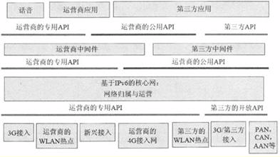 在某種意義上,下一代網(wǎng)絡(luò)必須是一種可編程的、基于IP的網(wǎng)絡(luò),這必然要求XG為應(yīng)用開(kāi)發(fā)提供強(qiáng)大的、方便的、定義明確的API。對(duì)于一些業(yè)務(wù)提供商來(lái)說(shuō),API思想本身并非僅僅是一個(gè)基本概念。目前,公共API是指所有第三方都可用的API,它包括標(biāo)準(zhǔn)的、開(kāi)放的API子集。另一方面,專(zhuān)用API是指由某個(gè)公司控制、僅僅在公司內(nèi)部或合作伙伴內(nèi)部可用的API。圖1給出了下一代網(wǎng)絡(luò)API體系結(jié)構(gòu)的一種高級(jí)分類(lèi)方法。