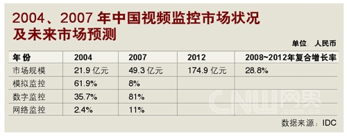 IDC的數(shù)字同樣樂觀。跟據(jù)IDC在2008年的預(yù)測,2008~2012年,中國視頻監(jiān)控市場的年均復(fù)合增長率將達28.8%,遠高于IT市場投入的平均增長率。而在模擬、數(shù)字與IP模式(即網(wǎng)絡(luò)監(jiān)控)組成的視頻監(jiān)控市場里,IP的增長率又將高于前二者,成為市場增長的強勁動力!保ㄗⅲ耗M監(jiān)控是指圖像信號在采集后,通過模擬信號傳輸?shù)姆忾]式視頻監(jiān)控系統(tǒng)模式;數(shù)字監(jiān)控是指圖像信號在采集后,經(jīng)過編碼轉(zhuǎn)化成數(shù)字信號再進行傳輸?shù)姆忾]或半封閉式視頻監(jiān)控系統(tǒng)模式;網(wǎng)絡(luò)監(jiān)控是指系統(tǒng)建立在以網(wǎng)絡(luò)為基礎(chǔ)的傳輸平臺的開放式視頻監(jiān)控系統(tǒng)模式)。