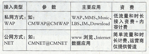 目前,運(yùn)營商采用兩種接入方式(WAP和NET)接入移動互聯(lián)網(wǎng),如表所示:
