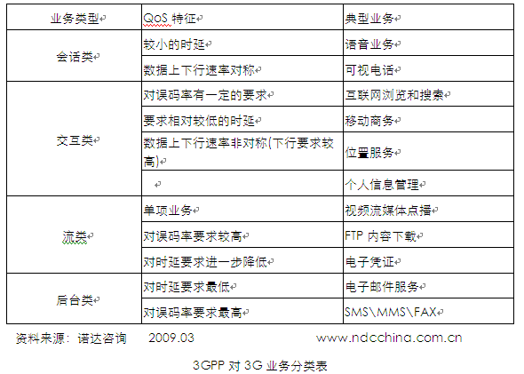 根據(jù)用戶對(duì)3G業(yè)務(wù)的體驗(yàn),其與2G業(yè)務(wù)的關(guān)系可以分為:繼承型業(yè)務(wù)(話音、SMS等)、提升型業(yè)務(wù)(移動(dòng)互聯(lián)網(wǎng)接入、POC、位置服務(wù)、移動(dòng)支付、整首歌曲下載等)、標(biāo)志型業(yè)務(wù)(可視電話、視頻流媒體點(diǎn)播直播、多媒體彩鈴、視頻會(huì)議等)