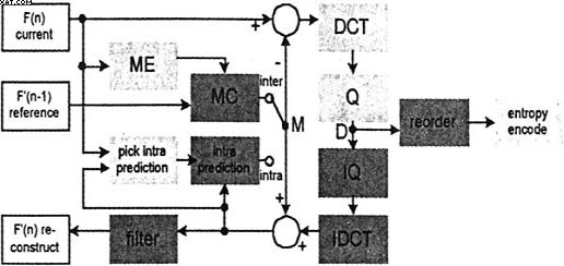 在前向通路(DCT到Q)中,每個MB可以以內模式或交互模式編碼。在內模式中,靠ME模塊在先編碼中求得參考MB。在交互模式中,從現(xiàn)在幀采樣中形成M。