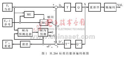 Abstraction Layer),負(fù)責(zé)對(duì)數(shù)據(jù)進(jìn)行打包和傳送。H.264編碼圖像通常分為三種類(lèi)型:I幀、P幀、B幀。I幀為幀內(nèi)編碼幀,其編碼不依賴(lài)于已編碼的圖像數(shù)據(jù)。P幀為前向預(yù)測(cè)幀,B幀為雙向預(yù)測(cè)幀,編碼時(shí)都需要根據(jù)參考幀進(jìn)行運(yùn)動(dòng)估計(jì)。同時(shí),H.264在提高圖像傳輸容錯(cuò)性方面做了大量工作,重新定義了適于圖像的結(jié)構(gòu)劃分。在編碼時(shí),圖像幀各部分被劃分到多個(gè)Slice結(jié)構(gòu)中,每個(gè)Slice都可以被獨(dú)立編碼,不受其他部分影響。Slice由圖像最基本的結(jié)構(gòu)——宏塊組成,每個(gè)宏塊包含一個(gè)16×16的亮度塊和兩個(gè)8×8的色度塊。H.264標(biāo)準(zhǔn)的整體編碼框圖如圖1所示。編碼過(guò)程中,原始數(shù)據(jù)進(jìn)入編碼器后,當(dāng)采用幀內(nèi)編碼時(shí),首先選擇相應(yīng)的幀內(nèi)預(yù)測(cè)模式進(jìn)行幀內(nèi)預(yù)測(cè),隨后對(duì)實(shí)際值和預(yù)測(cè)值之間的差值進(jìn)行變換、量化和嫡編碼,同時(shí)編碼后的碼流經(jīng)過(guò)反量化和反變換之后重構(gòu)預(yù)測(cè)殘差圖像,再與預(yù)測(cè)值相加得出重構(gòu)幀,得出的結(jié)果經(jīng)過(guò)去塊濾波器平滑后送入幀存儲(chǔ)器。采用幀間編碼時(shí),輸入的圖像塊首先在參考幀中進(jìn)行運(yùn)動(dòng)估計(jì),得到運(yùn)動(dòng)矢量。運(yùn)動(dòng)估計(jì)后的殘差圖像經(jīng)整數(shù)變換、量化和嫡編碼后與運(yùn)動(dòng)矢量一起送入信道傳輸。同時(shí)另一路碼流以相同的方式重構(gòu)后,經(jīng)去塊濾波后送入幀存儲(chǔ)器作為下一幀編碼的參考圖像。
