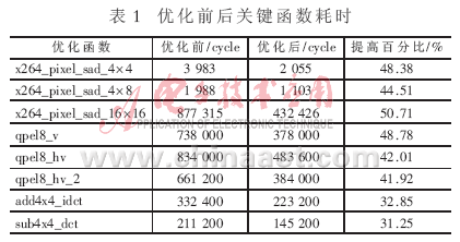 采用以上優(yōu)化方法對(duì)編碼關(guān)鍵函數(shù)進(jìn)行優(yōu)化,優(yōu)化前后函數(shù)耗時(shí)如表1所示?梢(jiàn),以上優(yōu)化方法能大幅度減少編碼時(shí)間。