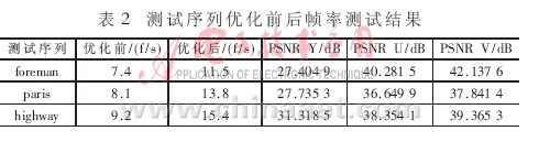 對(duì)三種測(cè)試序列在總線(xiàn)頻率120MHz下進(jìn)行優(yōu)化前后幀率測(cè)試,結(jié)果如表2所示。從表2可以看出,采用以上優(yōu)化方法能顯著提高幀率。