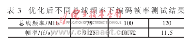 對(duì)于不同的總線(xiàn)頻率,優(yōu)化后編碼幀率不同,結(jié)果如表3所示,采用的測(cè)試序列為foreman。