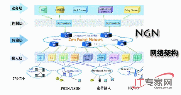 下一代網(wǎng)絡(luò)(NGN)是指以軟交換為代表,IMS為核心框架,能夠為公眾靈活提供大規(guī)模視訊話音數(shù)據(jù)等多種通信業(yè)務(wù),以分組交換為業(yè)務(wù)統(tǒng)一承載平臺,傳輸層適應(yīng)數(shù)據(jù)業(yè)務(wù)特征及帶寬需求,與通信運營商相關(guān),可運營、維護、管理的通信網(wǎng)絡(luò)。