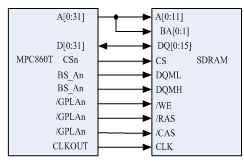 SDRAM的CLK信號由MPC860T的輸出時鐘CLKOUT驅(qū)動,/WE、/RAS和/CAS信號分別由UPMA的GPLA1~GPLA3產(chǎn)生。SDRAM的A10引腳要復用于SDRAM的刷新控制,因而必須與GPLAO相連(由于不方便連線圖中未畫出),因為MPC860T的GPLAO可以通過編程實現(xiàn)控制信號與地址信號的復用。MT48LC4M16A2內(nèi)部有12條行地址和8條列地址,行地址為高位地址,列地址為低位地址,而外部僅有12條地址信號A0~A11。這就需要對UPM對地址進行復用。MPC860T支持內(nèi)部地址復用,可以通過UPM的RAM字中的AMX位進行配置,同時將OR寄存器中的SAM位同時進行配置。相關(guān)寄存器配置為:BR2=Ox0000081,說明:32位寬,無奇偶校驗,無寫保護,選擇UPMA,基地址00000000;OR2=OxFF000A00,說明:16Mbyte容量,地址復用。