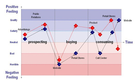 看一看“情感曲線”也許你就會(huì)頓悟。此處所示的兩條曲線來(lái)自兩個(gè)國(guó)際銀行。請(qǐng)注意曲線的不同之處。紅線所示的銀行與藍(lán)線所示的銀行相比在呼叫中心服務(wù)和店內(nèi)體驗(yàn)上都要略勝一籌。而藍(lán)線所示銀行在網(wǎng)上銀行這一項(xiàng)上表現(xiàn)更好。“紅線”銀行的競(jìng)爭(zhēng)資本是其卓越的客戶互動(dòng)體驗(yàn),無(wú)論是分行的面對(duì)面互動(dòng)還是來(lái)自聯(lián)絡(luò)中心的遠(yuǎn)程體驗(yàn)都屬一流。