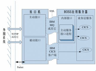由圖1可知,從調(diào)用方向的角度看,接口可分為主動(dòng)接口和被動(dòng)接口,分別表示BOSS調(diào)用外圍系統(tǒng)服務(wù),以及外圍系統(tǒng)調(diào)用BOSS服務(wù)。主動(dòng)接口由BOSS應(yīng)用服務(wù)器驅(qū)動(dòng),即BOSS應(yīng)用服務(wù)器上的主動(dòng)服務(wù)接口進(jìn)程,是調(diào)用CICS對(duì)相關(guān)待處理表進(jìn)行輪詢,并將每一條記錄封裝為一條消息放入MQ隊(duì)列(該隊(duì)列均由消息組成),接口機(jī)上的主動(dòng)接口再從隊(duì)列中取出消息進(jìn)行解析,進(jìn)而根據(jù)控制信息發(fā)送到指定系統(tǒng)執(zhí)行。被動(dòng)接口則是由外圍系統(tǒng)驅(qū)動(dòng),通過接口機(jī)上的CICS客戶端調(diào)用BOSS應(yīng)用服務(wù)器上的業(yè)務(wù)層服務(wù)操作數(shù)據(jù)庫。
