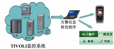 在具體實(shí)施上,為了形成統(tǒng)一的體系以方便監(jiān)控并達(dá)到告警信息與實(shí)時(shí)的反饋,可將以上4個(gè)層面因素納入IBM公司開發(fā)的TIVOLI監(jiān)控系統(tǒng)。除此之外,為實(shí)現(xiàn)告警信息的自動(dòng)推送與分發(fā),可將自行開發(fā)告警信息轉(zhuǎn)發(fā)程序接入TIVOLI監(jiān)控系統(tǒng)信息庫。一旦檢測(cè)到異常信息存在則立即進(jìn)行短信或郵件的發(fā)送,確保維護(hù)人員及時(shí)了解接口系統(tǒng)運(yùn)行情況。整個(gè)過程如圖2所示。
