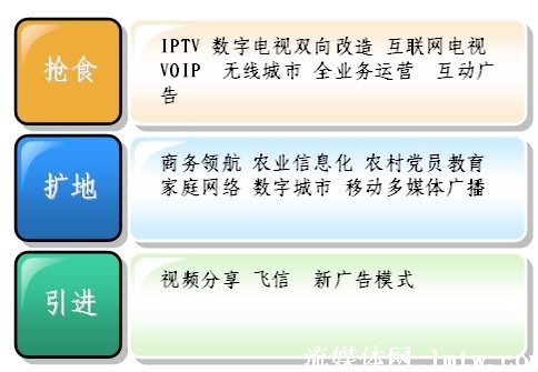 從廣義上講,廣電、電信、互聯(lián)網(wǎng)都屬于信息行業(yè),現(xiàn)在都面臨著自己在增長(zhǎng)中遇到的問(wèn)題,也就是滯漲。滯漲逼迫大家必須去轉(zhuǎn)型,轉(zhuǎn)型現(xiàn)在有三種方式,一個(gè)是搶?zhuān)粋(gè)是擴(kuò),一個(gè)是引進(jìn)。從最近會(huì)議上來(lái)看,目前大家對(duì)搶食比較感興趣,畢竟有現(xiàn)成的一碗紅燒肉已經(jīng)做好了,對(duì)后面兩個(gè),相對(duì)來(lái)說(shuō)談得還比較少,因?yàn)楹竺鎯蓚(gè),需要引入一些創(chuàng)新的技術(shù),引入創(chuàng)新的思維。