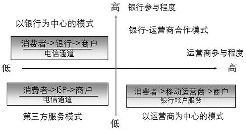 系統(tǒng),通過定制終端,電信運(yùn)營(yíng)商可以將各種先進(jìn)的移動(dòng)應(yīng)用提供給用戶,使用戶獲得良好的移動(dòng)化生活體驗(yàn)。因此,電信運(yùn)營(yíng)商在移動(dòng)支付方面具有較好的用戶資源和營(yíng)銷渠道?梢姡娦胚\(yùn)營(yíng)商和銀行的協(xié)作程度在很大程度上決定了移動(dòng)支付商業(yè)模式的績(jī)效水平。