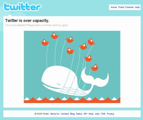 當(dāng)Twitter宕機或者訪問量超過負(fù)荷時,用戶會被導(dǎo)向一個顯示有“失落的鯨魚”的頁面