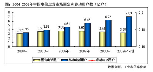 圖: 2004-2009年中國電信運(yùn)營市場固定和移動用戶數(shù)