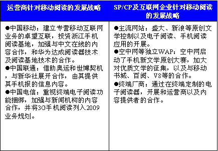 隨著3G的啟動,越來越多的傳統(tǒng)互聯(lián)網(wǎng)巨頭、運(yùn)營商、手機(jī)廠商等紛紛介入無線互聯(lián)網(wǎng)領(lǐng)域,而更多的新興企業(yè)也加入到競爭中來。從目前市場的發(fā)展情況來看,運(yùn)營商由于其依托的用戶資源以及對網(wǎng)絡(luò)資源的控制,在移動閱讀產(chǎn)業(yè)中占據(jù)了優(yōu)先的主動權(quán),然而針對移動閱讀,其內(nèi)容資源環(huán)節(jié)稍顯薄弱,傳統(tǒng)電子書產(chǎn)品資源豐富然而涉及版權(quán)問題,不能大規(guī)模應(yīng)用于移動領(lǐng)域,因此優(yōu)質(zhì)的內(nèi)容將是移動閱讀產(chǎn)業(yè)發(fā)展的核心競爭優(yōu)勢。針對此,運(yùn)營商也相應(yīng)加大了對優(yōu)質(zhì)內(nèi)容的挖掘和控制。以中國移動為例,于2009年3月和浙江省人民政府代表簽署了長期戰(zhàn)略合作協(xié)議,并將在兩年內(nèi)投入5000萬元,支持浙江手機(jī)閱讀基地的建設(shè)。
