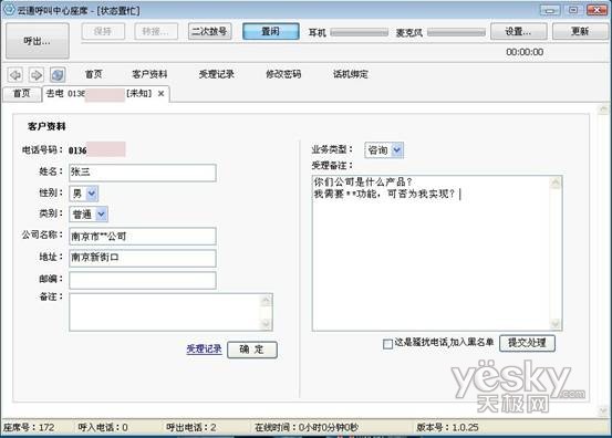 除此之外,當使用座席軟件呼出時,若該號碼之前撥打過并留下過相關(guān)客戶信息,彈屏內(nèi)容會顯示其詳細的個人信息,并提供歷史受理記錄的查詢接口,起到輔助營銷人員的受理工作的作用,試問,如果再次撥打電話時就能詳細說出用戶的姓名以及當時所提的需要,他是否會覺得很親切?(如下圖)如果該號碼未有客戶資料的記錄時,彈屏會直接為客服提供客戶詳情填寫頁面,便于營銷人員很方便的就可以建立該客戶的個人檔案,提高受理效率。