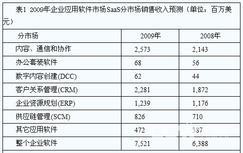 在Gartner的統(tǒng)計(jì)中,SaaS領(lǐng)域中,除了CRM之外,內(nèi)容、通訊和協(xié)作市場(chǎng)同樣表現(xiàn)不俗,在2009年,這一市場(chǎng)的銷售收入將從2008年的21.4億美元增長(zhǎng)到26億美元,甚至超過了CRM分市場(chǎng)的23億美元。其他如ERP分市場(chǎng)等同樣占據(jù)不小的份額。