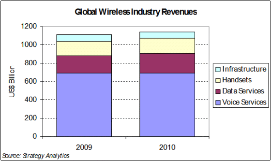 2009年,無線數(shù)據(jù)業(yè)務(wù)收入比上年增長了9.5%,支撐了行業(yè)總收入沒有下滑。Strategy Analytics預(yù)測2010年無線數(shù)據(jù)業(yè)務(wù)收入將增長13%,市場整體規(guī)模將超過2000億美元。