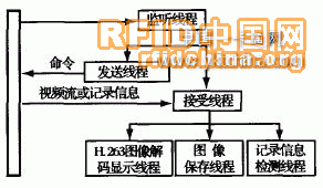 在軟件設(shè)計(jì)方面包括兩部分,一部分是監(jiān)控終端的監(jiān)控軟件,另一部分是各便件的底層軟件。監(jiān)控終端采用了多線程的軟件設(shè)計(jì)方法,系統(tǒng)對(duì)連接的每一個(gè)監(jiān)控點(diǎn)共采用了6個(gè)線程,即網(wǎng)絡(luò)監(jiān)聽線程、發(fā)送線程、接受線程、H.26 3圖像解碼顯示線程、圖像保存線程和記錄信息(門口終端的撥號(hào)、門禁一卡通等記錄信息)檢測線程,如圖4所示。