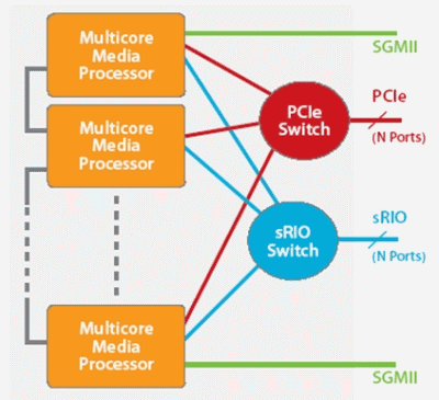 圖3說(shuō)明,高速串行I/O在復(fù)雜視頻處理任務(wù)中的潛在應(yīng)用。圖中顯示用于擴(kuò)展多個(gè)器件中多核器件處理能力的連接方案,其可以實(shí)現(xiàn)更復(fù)雜的視頻處理運(yùn)算或支持更多視頻轉(zhuǎn)碼通道。采用sRIO開關(guān)能夠?qū)崿F(xiàn)更靈活的器件間通信,不過(guò)如果處理流處于相鄰器件之間,也可以不采用這種開關(guān)。與PCIe開關(guān)相比,sRIO由于其數(shù)據(jù)包開銷較低,因此一般成本更低、性能更高、且時(shí)延更短。