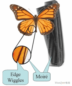為了反映鏡像邊帶沒有衰減的效果,圖3b和3c示意了奈奎斯特頻率和時鐘頻率處的頻譜重疊。這些疊加的鏡像邊帶信號(圖3d)與視頻信號相比具有隨機的相位差。圖4表示我們需要避免的圖像誤差。“邊緣擺動”是高頻邊緣干擾,它重疊在視頻信號上,具有隨機變化的相位。摩爾效應(yīng)是時鐘、視頻信號頻率之間相互作用的結(jié)果。