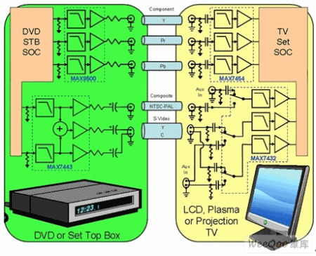 圖6左側(cè)是機頂盒或DVD機的框圖,片上系統(tǒng)(SOC)包含了DAC,輸出經(jīng)過低通濾波器(例如MAX7443)進行視頻重建。濾波器芯片還包含75Ω同軸電纜驅(qū)動器,驅(qū)動信號在電纜上的傳輸。圖6右側(cè)用于信號接收,信號在經(jīng)過抗混疊濾波器后送入電視機SOC的ADC。
