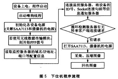下位機(jī)軟件通過驅(qū)動程序提供的接口,在遠(yuǎn)程圖像監(jiān)控設(shè)備中完成硬件的初始化、控制等功能,同時又負(fù)責(zé)圖像的壓縮和傳輸。它是所有設(shè)備的控制中樞,因此這里著重描述下位機(jī)軟件的工作流程,如圖5所示。