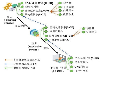 CI/KPI模型的建立,成功地將傳統(tǒng)監(jiān)控系統(tǒng)的監(jiān)控難點(diǎn)轉(zhuǎn)變?yōu)榱咙c(diǎn),通過對(duì)模型中父子業(yè)務(wù)間關(guān)系、業(yè)務(wù)與后臺(tái)資源間關(guān)系的結(jié)構(gòu)化梳理,多維度數(shù)據(jù)的采集計(jì)算,有效量化了業(yè)務(wù)健康度指標(biāo)。同時(shí),模型中所綜合的業(yè)務(wù)可用性、業(yè)務(wù)辦理量、后臺(tái)資源使用情況等全方位信息,尤為適合公司管理人員了解業(yè)務(wù)通體運(yùn)營情況。