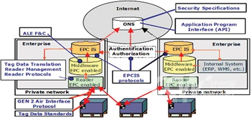 EPCglobal提出了Auto-ID系統(tǒng)的五大技術(shù)組成,分別是EPC(電子產(chǎn)品碼)標(biāo)簽、RFID標(biāo)簽閱讀器、ALE中間件實(shí)現(xiàn)信息的過濾和采集、EPCIS信息服務(wù)系統(tǒng),以及信息發(fā)現(xiàn)服務(wù)(包括ONS和PML)。由于從一開始就讓世界各大洲的從業(yè)人員充分參與,EPCGlobal標(biāo)準(zhǔn)(架構(gòu)圖如下)得到了較廣泛認(rèn)同,這里不再對其標(biāo)準(zhǔn)體系架構(gòu)贅述。
