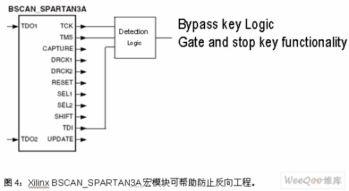 平臺中, 可在設(shè)計中使用BSCAN_SPARTAN3A宏模塊,其檢測邏輯可監(jiān)控FPGA構(gòu)造中的JTAG控制信號,如圖4所示。如果檢測到JTAG控制信號的活動,用戶在設(shè)計可以立即繞過關(guān)鍵邏輯或關(guān)斷關(guān)鍵功能,不再執(zhí)行正確的功能。這樣反向工程人員讀到的將是不正確的功能模塊,在不能完成預(yù)期功能的解決方案上浪費時間和資源。